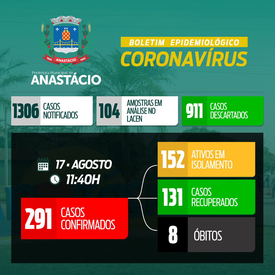 Ao longo das últimas 24 horas, mais 11 casos do novo coronavírus (Covid-19) foram confirmados em Anastácio. O boletim da Secretaria Municipal de Saúde foi atualizado no fim da manhã desta segunda-feira (17).