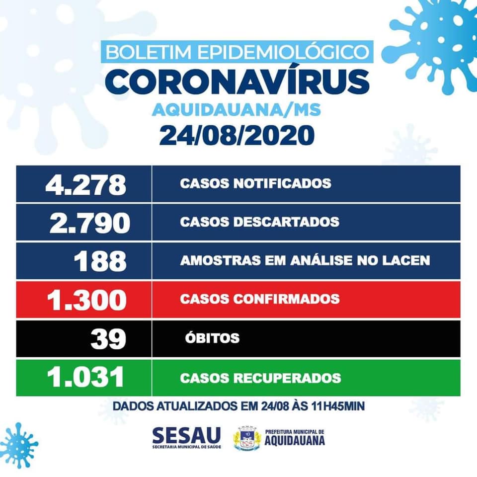 Com duas mortes registradas ao longo das últimas 24 horas, embora nenhuma delas tenha ocorrido nesse período, Aquidauana chegou a 39 vidas perdidas por causa do novo coronavírus (Covid-19). O boletim epidemiológico municipal foi atualizado no fim da manhã desta segunda-feira (24), às 11h45.