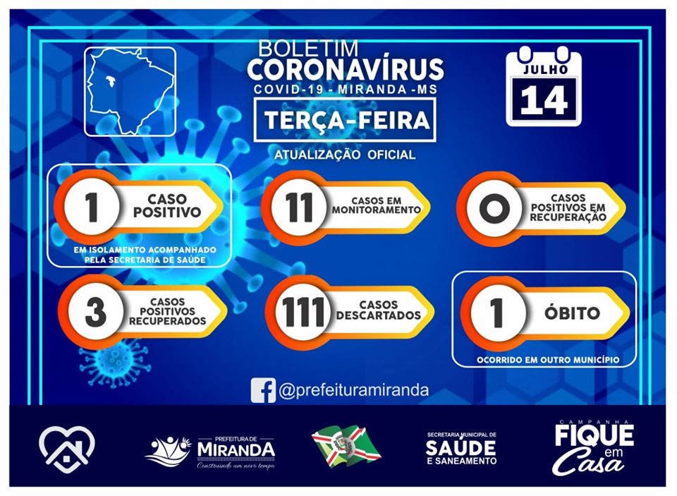Miranda registrou, no boletim desta terça-feira (14), a primeira morte decorrente do novo coronavírus (Covid-19). Trata-se de um homem, 46 anos, que estava internado na Santa Casa de Corumbá, no CTI (Centro de Terapia Intensiva) destinado a pacientes infectados ou com suspeita da doença. Não foi relatado se possuía comorbidades.